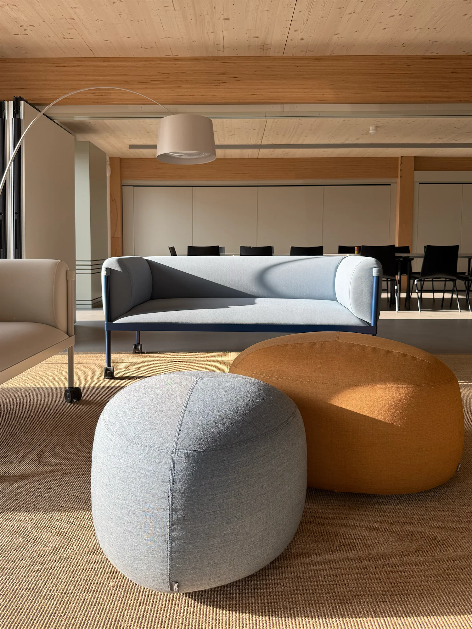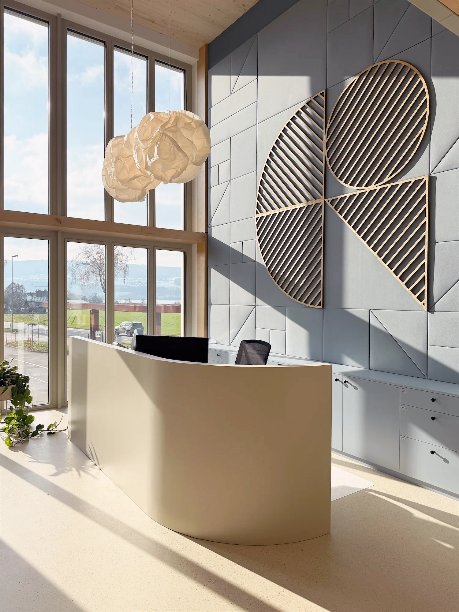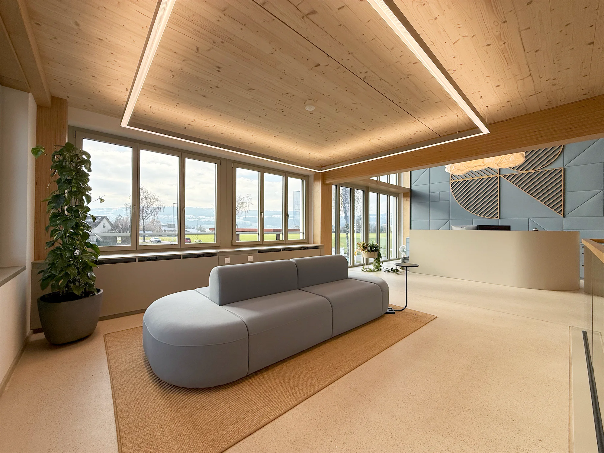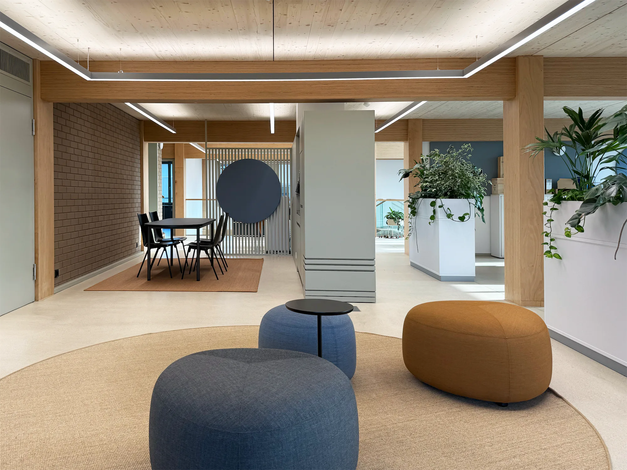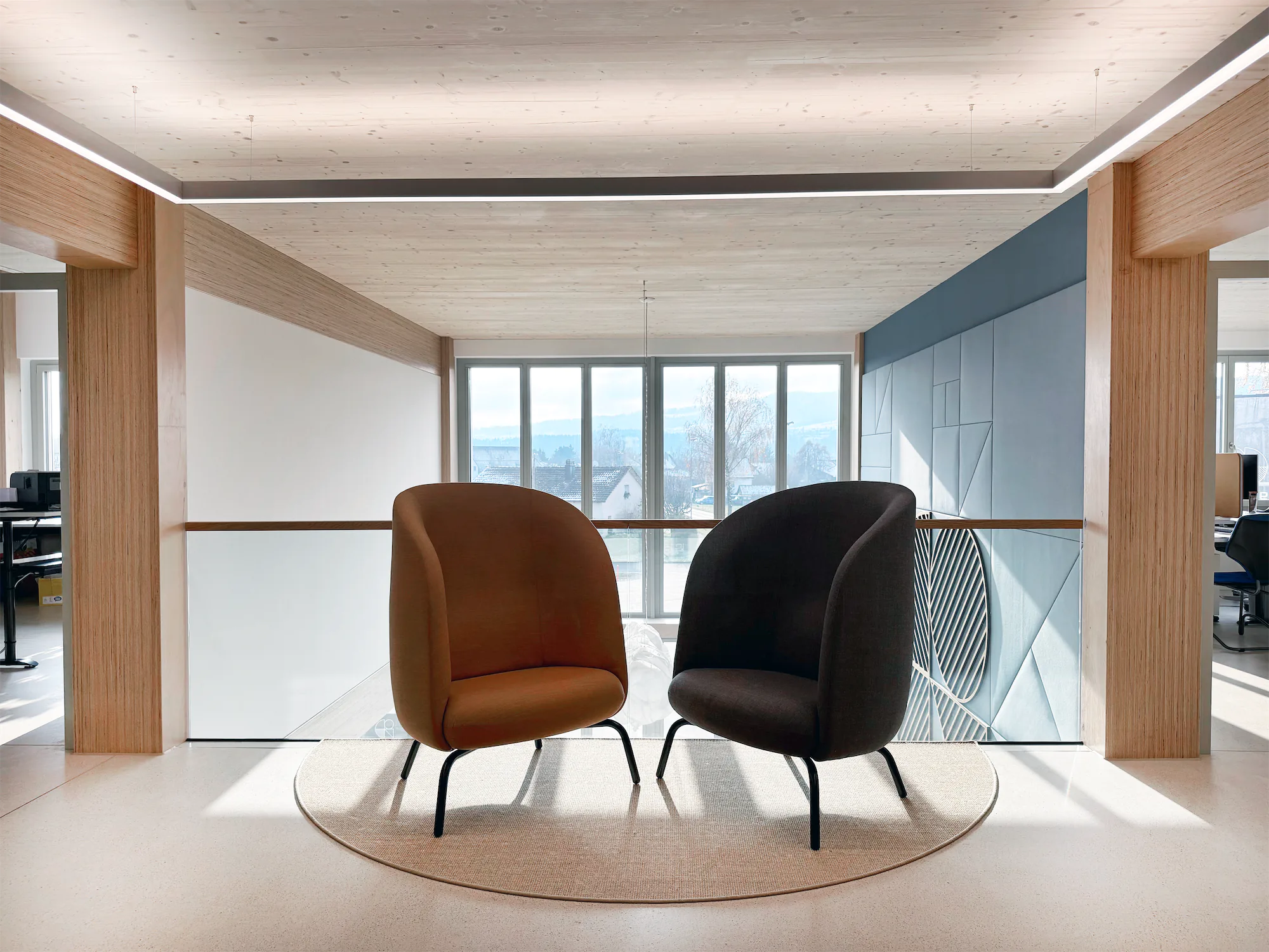 Das Corporate Design diente als Grundlage für Materialität, Farbwelt und Zonierung. Ruhige Naturtöne, akzentuiert durch die strukturierten Markenfarben, verleihen den Räumen eine klare Ordnung und gleichzeitig Wärme.