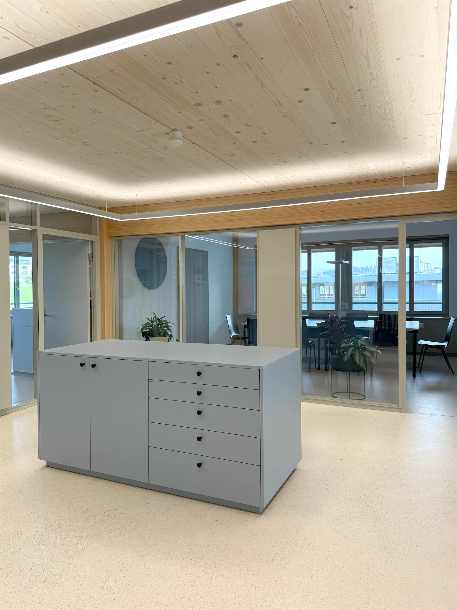 Das Raumkonzept folgt den Arbeitsabläufen von Gadola und gliedert das Büro in klar definierte Zonen: offene Bereiche für Austausch, Rückzugsräume für fokussiertes Arbeiten, flexible Meetingzonen sowie Gemeinschaftsflächen für das Team.